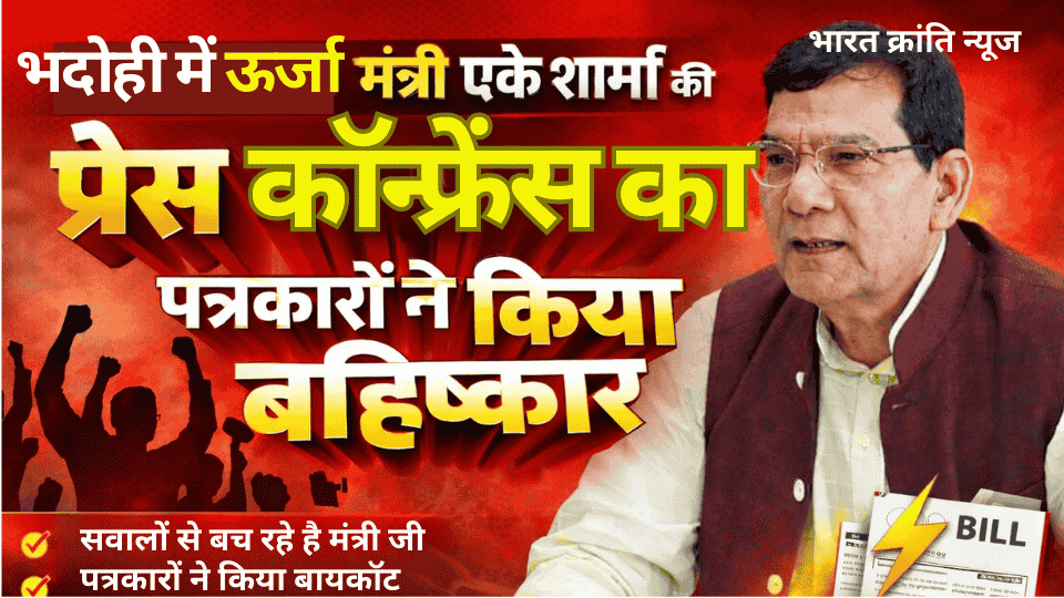 ऊर्जा मंत्री एके शर्मा की प्रेस कॉन्फ्रेंस का पत्रकारों ने किया बहिष्कार जनता के सवालों पर चुप्पी, भदोही मीडिया में रोष भदोही | 22 फरवरी 2026 (रविवार) जनपद भदोही में आज एक अभूतपूर्व निर्णय लेते हुए समस्त मीडिया परिवार ने ऊर्जा मंत्री एके शर्मा की प्रेस कॉन्फ्रेंस का सर्वसम्मति से