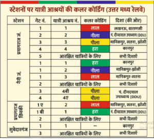 महाकुंभ के दौरान प्रयागराज रेलवे स्टेशनों पर यात्रियों के लिए रंगों के अनुसार पृथक आश्रय (शेल्टर) तय किए गए हैं: